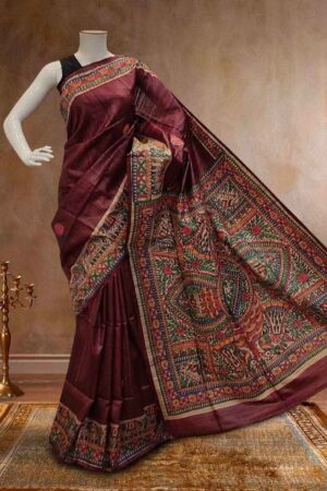 ✨ Festive special Pure Tussar Ghiccha Silk saree featuring beautiful Madhubani hand-painted design. 100% handloom weaving, Silk Mark certified purity, premium festive wear.