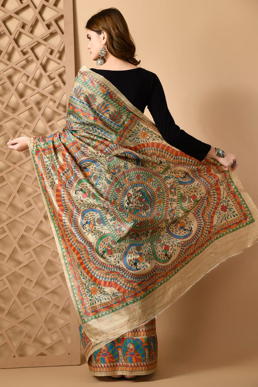Make a timeless statement at weddings and special celebrations with this Pure Tussar Ghiccha Silk Saree, exquisitely crafted with beautiful Madhubani hand-painted full saree work. This masterpiece reflects rich Indian artistry, heritage weaving, and luxurious elegance.
