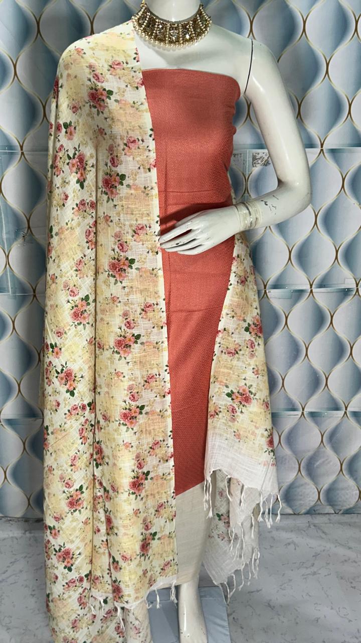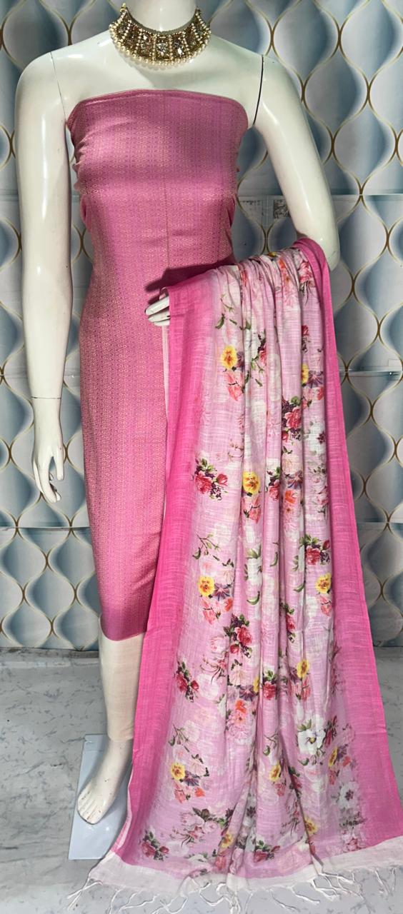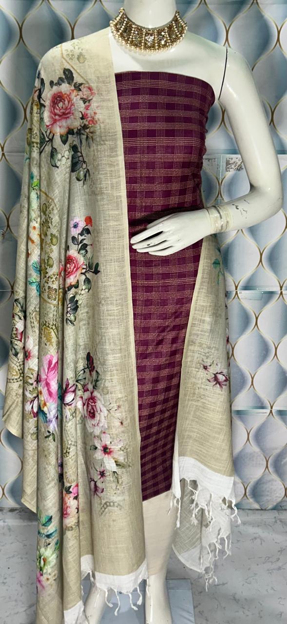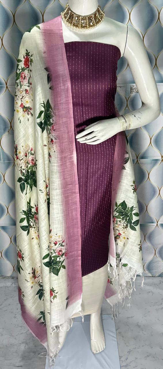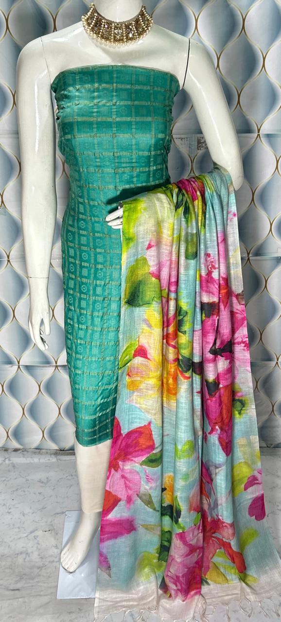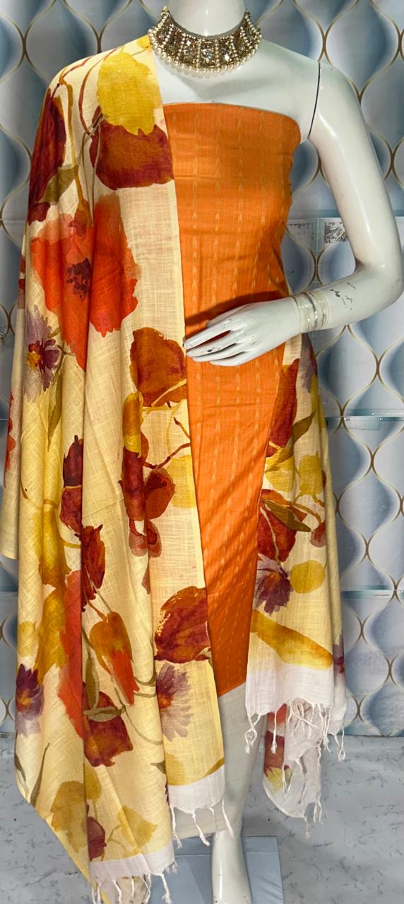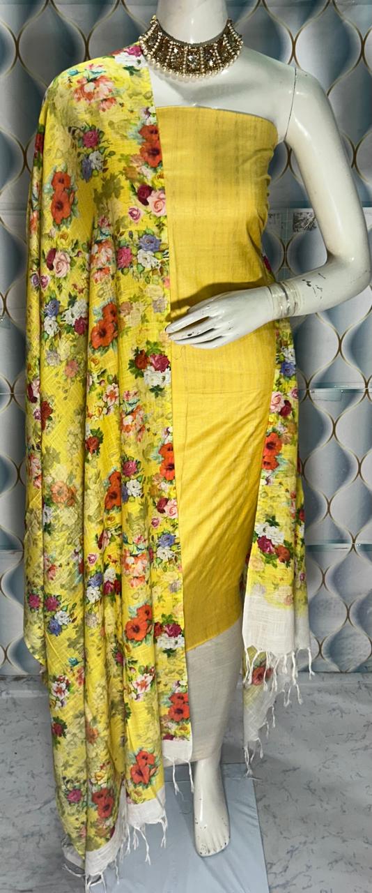 Enhance your ethnic collection with this graceful Semi Tussar Silk Dress Material, designed with a stylish contrast dobi weaving top and a stunning digital printed dupatta. A perfect combination of tradition and modern elegance.
